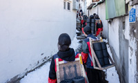 조끼와 장갑, 조별로 색이 다른 토시를 받아 착용하고 활동 준비를 마칩니다. 백여 명이 모이니 공터가 꽉 찹니다. 몇 년 만의 활동이라 연탄 배달에 처음 참여하시는 분들도 많아서 그런지 기대와 긴장감이 느껴졌습니다. 이번에 배달할 6천 장의 연탄은 네 곳에 나눠져 있었고, 조별로 연탄이 있는 장소로 이동하여 본격적인 배달 활동을 시작하였습니다. 지게를 이용해 계단이 많고 좁은 곳을 지나 연탄 받으시는 댁의 연탄 창고에 쌓아갑니다. 연탄 한 장의 무게는 3.65kg 정도로 생각보다 꽤 무겁습니다. 한 번에 12개를 지고 옮기는 분도 계신데, 쌀 반가마니 보다 무거운 무게네요.