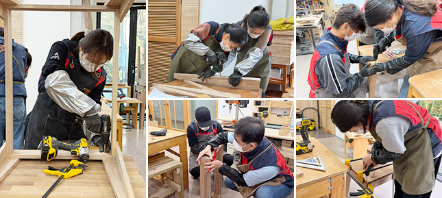 오색오감 중에서 신청자 마감이 가장 빠르게 되는 것이 언제나 목공 활동입니다. 사회취약계층 가정에서 필요로 하는 가구를 맞춤으로 만들어 기부하는 활동으로 이번에도 판교유스센터 내 목공장에서 총 네 번의 활동을 했습니다. 11월 중순이지만 춥지 않은 날씨에서 작업할 수 있었습니다. 이번 목공 활동에서는 독거노인 여섯 가정에 드릴 가구를 만들게 되었는데요. 혼자 살고 계신 어르신들께서 가장 필요로 하는 1인용 식탁과 의자 세트입니다. 식탁 6개, 의자 6개를 만들었지만 어르신들께서 원하는 크기에 맞춰 설계된 맞춤 가구로 똑같은 것은 하나도 없습니다.