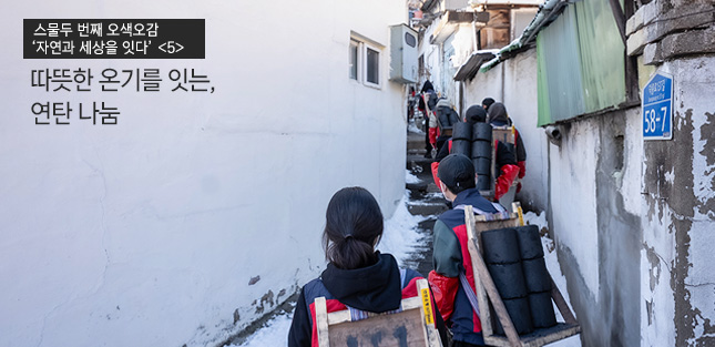 12월 첫째 주, 오색오감의 마지막을 장식하는 활동은 '연탄 나눔'입니다. 연탄에 의지하여 겨울을 나야 하는 에너지 취약계층에 연탄 후원과 배달을 하고 있는데요. 오색오감 연탄 배달에 참여하는 많은 분들이 이 활동을 하면 '한 해가 다 갔구나' 하는 생각이 든다고 합니다. 연탄 배달 활동지의 재개발 소식이 점차 전해지고 있어, 앞으로 얼마나 더 이 활동이 가능할지 모르겠습니다. 이제는 이주한 가구가 많아 한꺼번에 배달이 많이 필요한 가구가 모여있지 않다고 하여, 인원 규모를 60여 명으로 줄여 활동을 하게 되었습니다. 그래도 아직은 연탄을 필요로 하는 가정들이 있습니다. 교통대란이 있었을 만큼 많은 첫눈이 내린 다음 날이어서 걱정을 하며 서울시 상계동의 활동지를 찾았습니다.