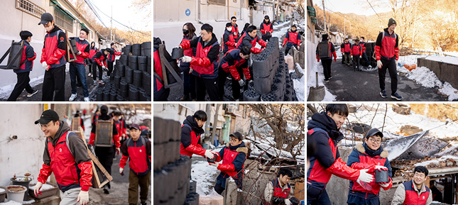 주민분들이 골목골목 눈을 치워두기도 하셨고, 해가 나면서 큰 길에는 눈이 녹아 연탄 배달은 무리 없이 할 수 있을 정도였습니다. 현장에 모인 임직원들은 장갑, 토시, 조끼를 착용하고 활동 준비를 합니다. 연탄 배달이 오색오감의 대표 활동인 만큼 수 년째 참여해 주시는 분들도 많지만, 처음 참여하시는 분들도 의외로 많았습니다. 연탄 배달 활동을 처음 할 때 가장 놀라는 것이 연탄의 무게입니다. 연탄 1개가 3.65kg 정도로 생각보다 꽤 무겁습니다. 눈도 많이 내린 만큼 무엇보다 안전을 강조하며 2개 조로 나눠서 활동을 시작했습니다.