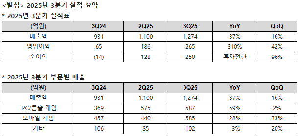 3분기 매출은 1,274억 원으로 전년 동기 대비 37%, 전 분기 대비 16% 증가했다. 영업이익은 265억 원을 기록, 전년 동기 대비 310%, 전 분기 대비 42% 상승했다. 순이익은 250억 원으로 전년 동기 대비 흑자전환, 전 분기 대비 96% 늘었다.