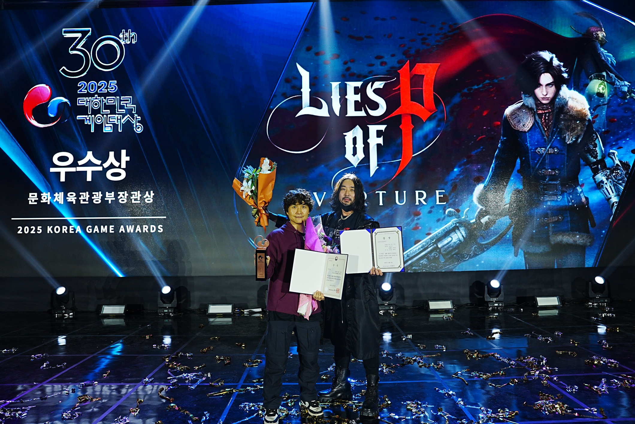 [2025-1113] (주)네오위즈(공동대표 김승철, 배태근)는 지난 12일 열린 ‘2025 대한민국게임대상’ 시상식에서 ‘P의 거짓: 서곡(Lies of P: Overture)’이 기술창작상 캐릭터 부문과 우수상을 수상했다고 13일 밝혔다. 대한민국게임대상 역사상 DLC가 수상한 것은 이번이 최초다.