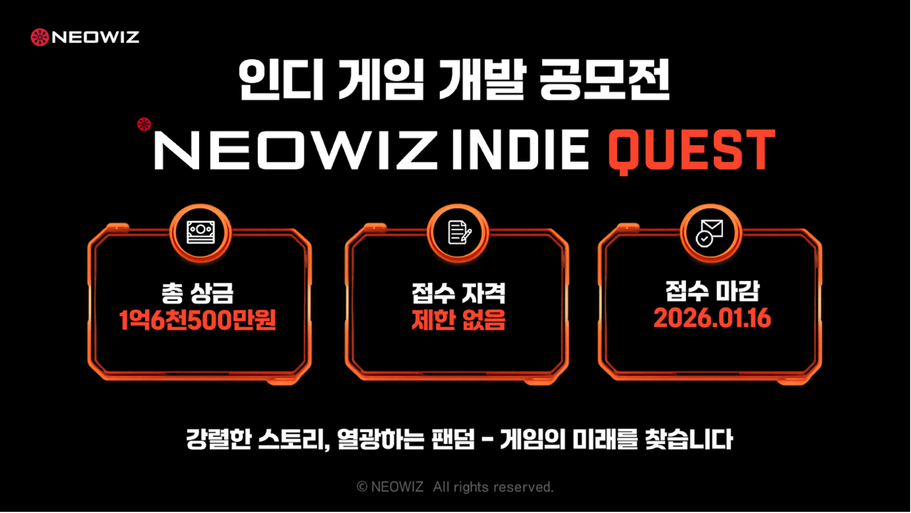 [2025-1229] (주)네오위즈(공동대표 김승철, 배태근)는 자사가 진행 중인 내러티브 인디 게임 개발 공모전 ‘네오위즈 인디 퀘스트(NEOWIZ Indie Quest)’의 공식 홈페이지 리뉴얼을 진행했다고 29일 밝혔다.