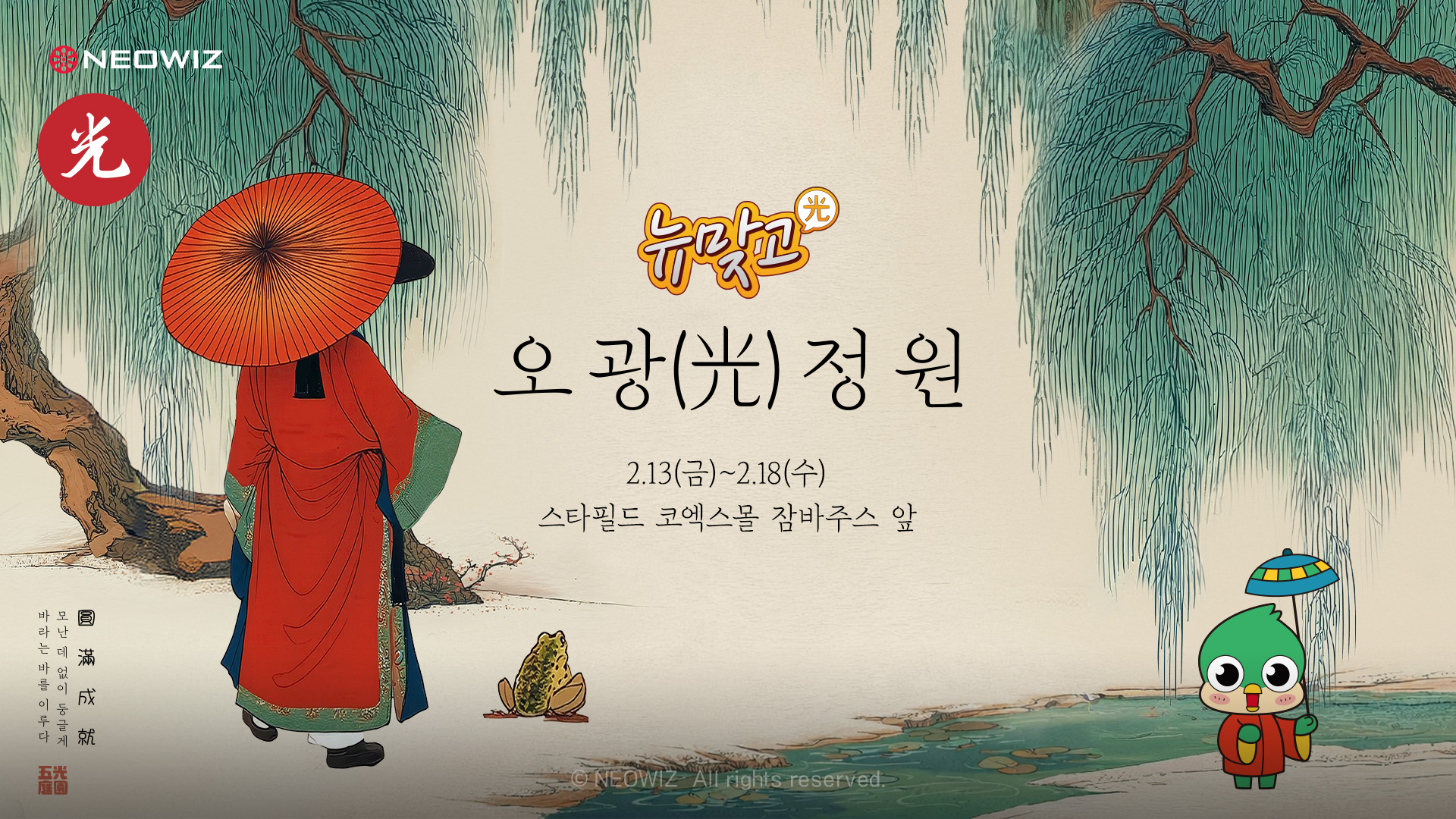 [2026-02-12] ㈜네오위즈(공동대표 김승철, 배태근)는 설을 맞아 자사가 서비스 중인 보드게임 ‘피망 뉴맞고’가 스타필드 코엑스몰과 협업해 오프라인 체험형 팝업 부스 ‘뉴맞고 오광(光)정원’을 운영한다고 12일 밝혔다.